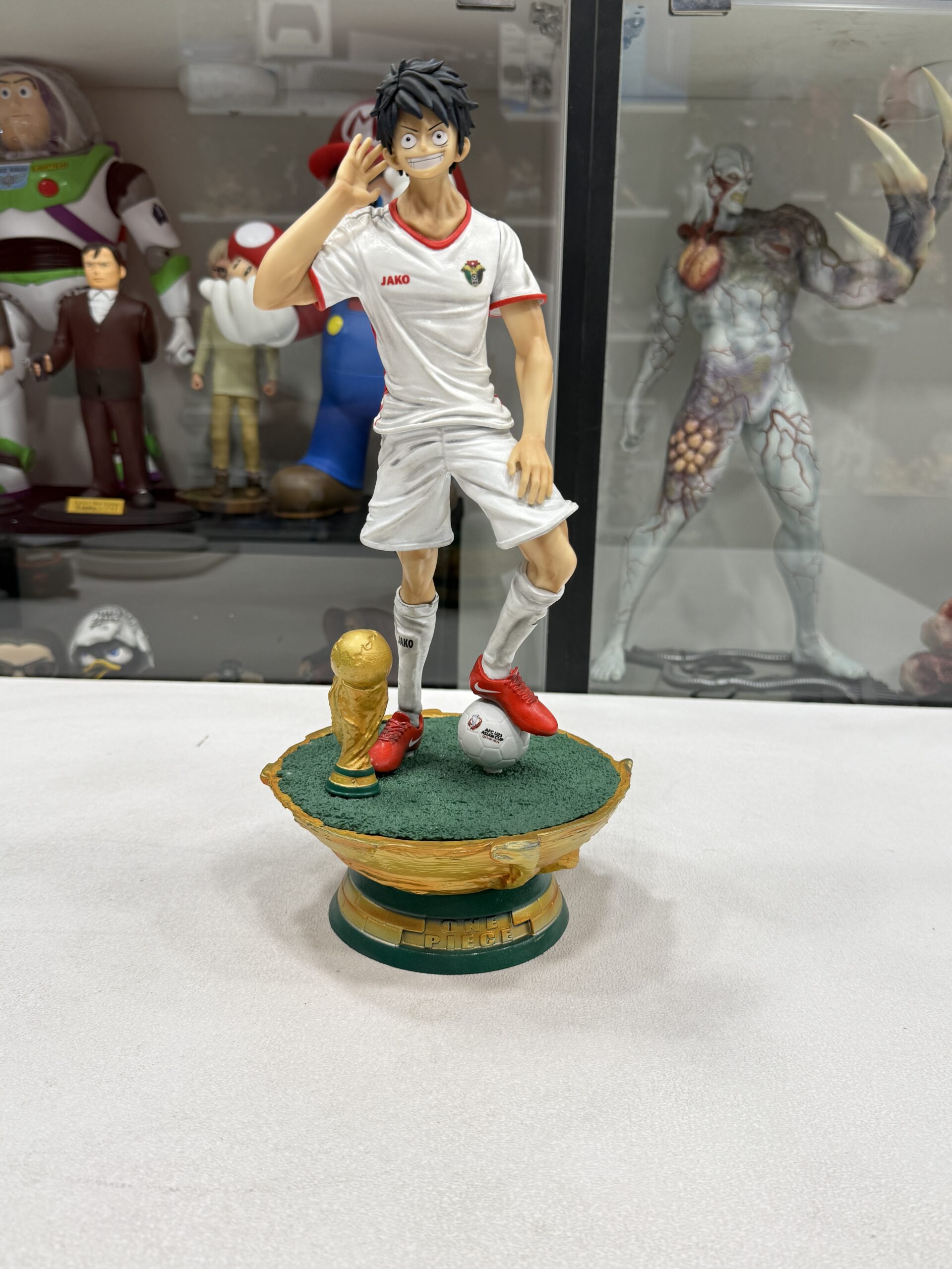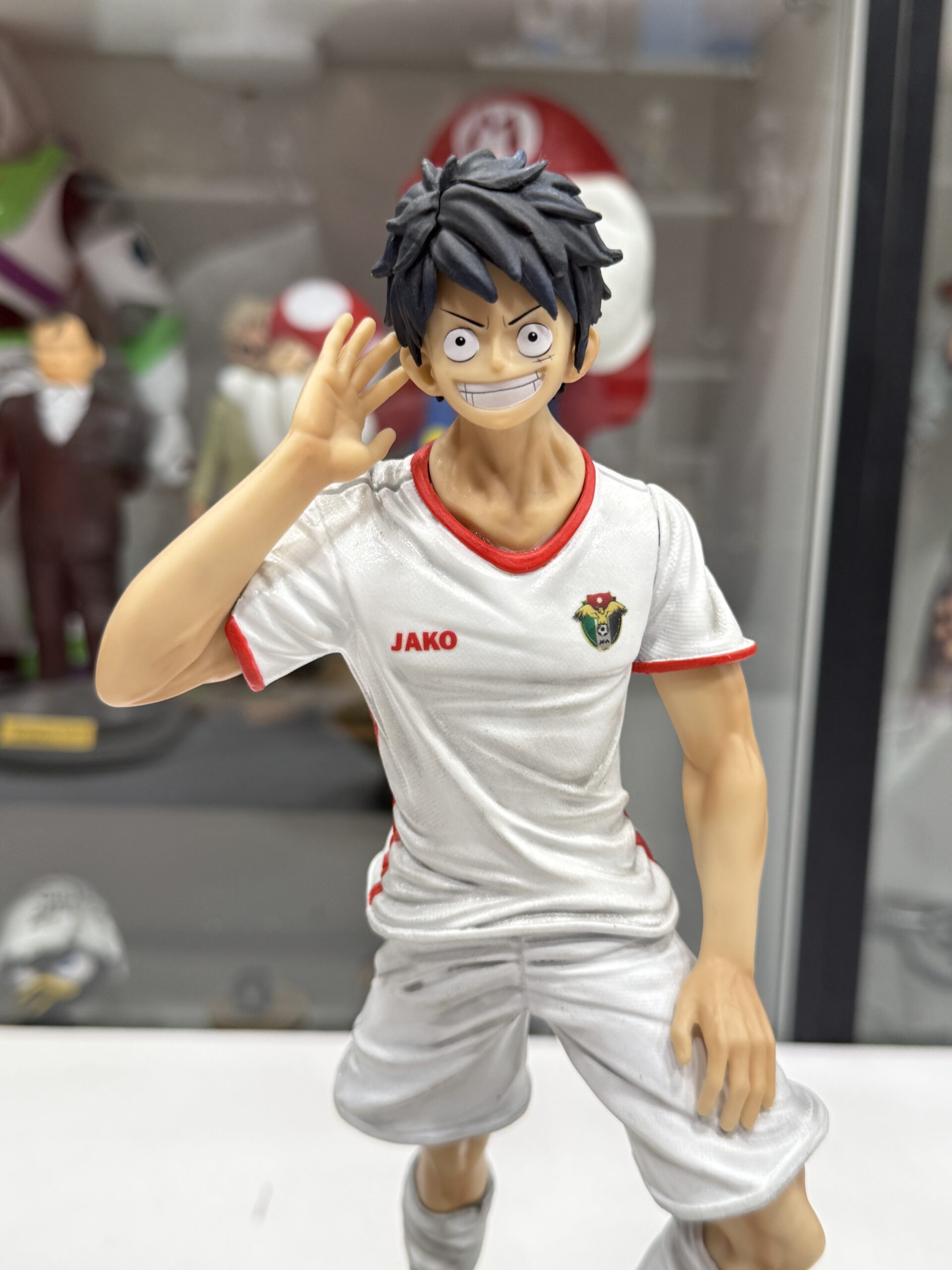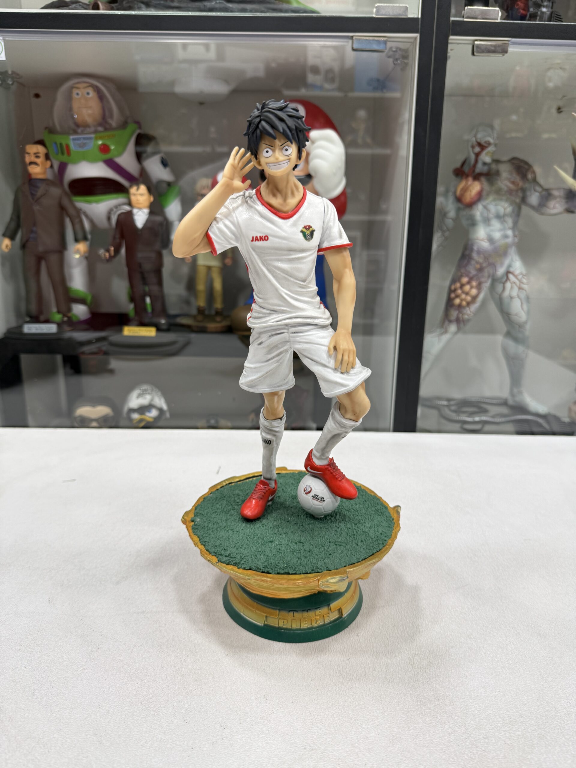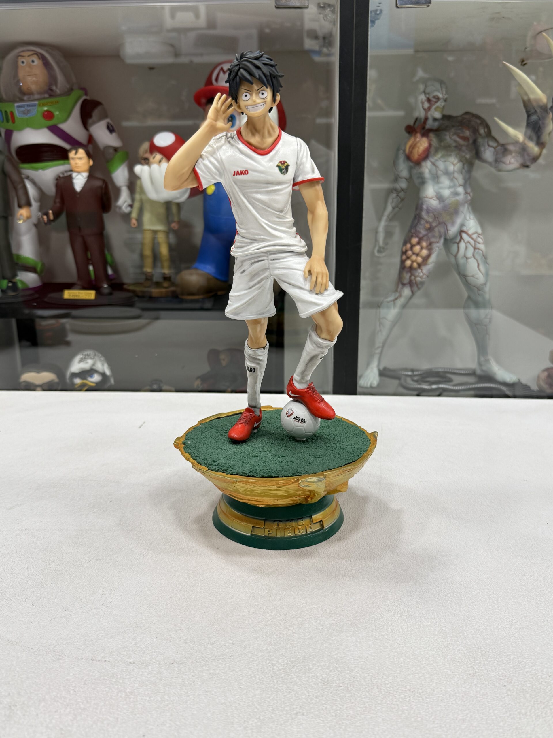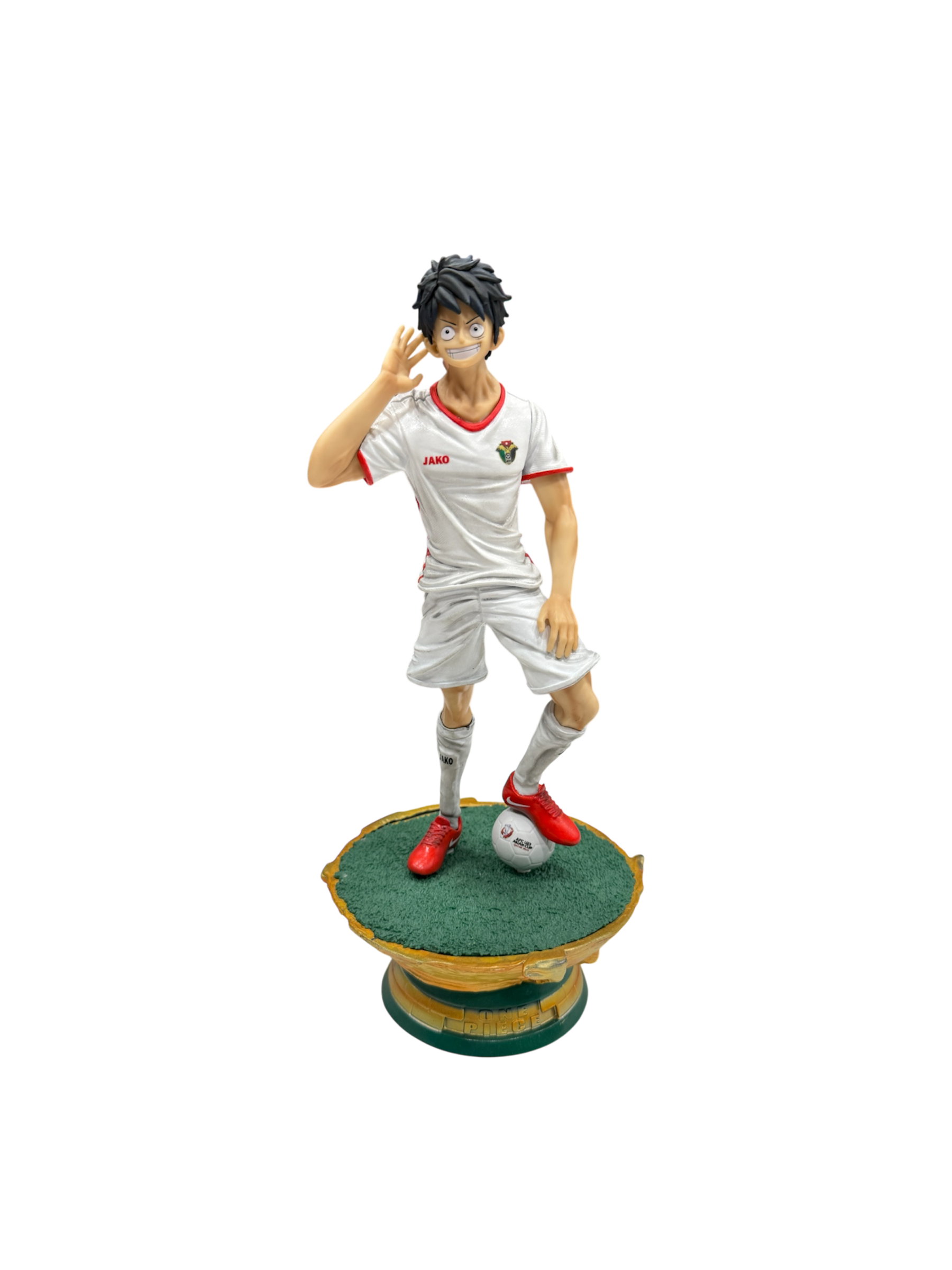 This statue represent luffy from One Piece in Jordan national team t-shirt with custom-made