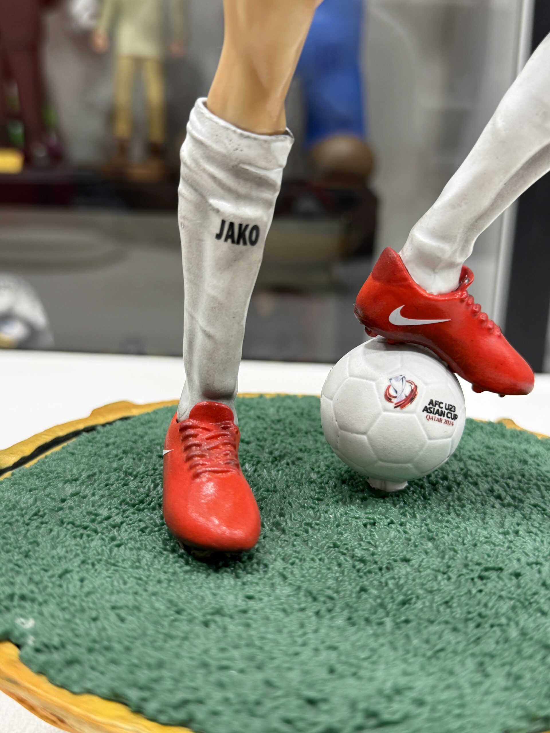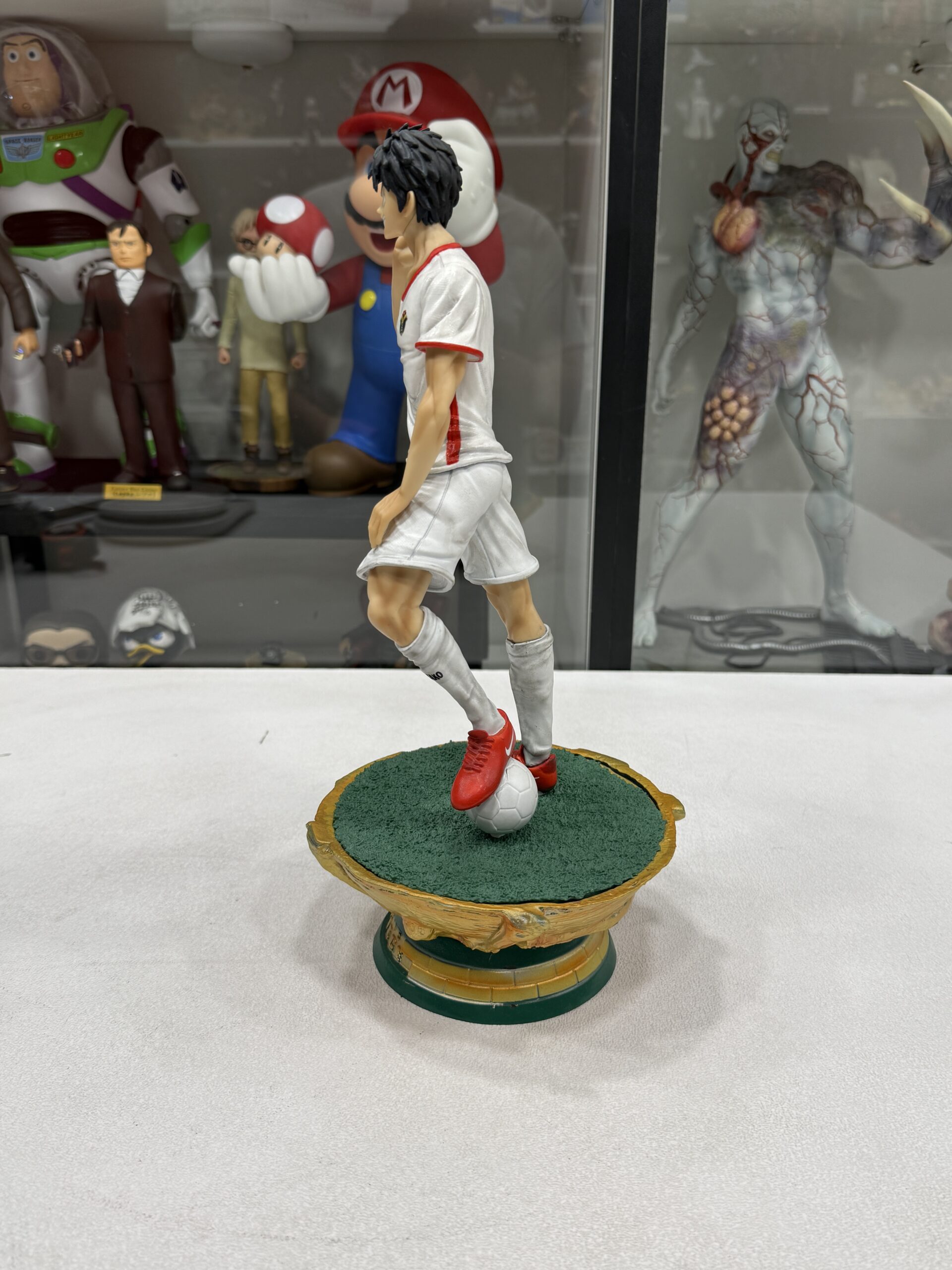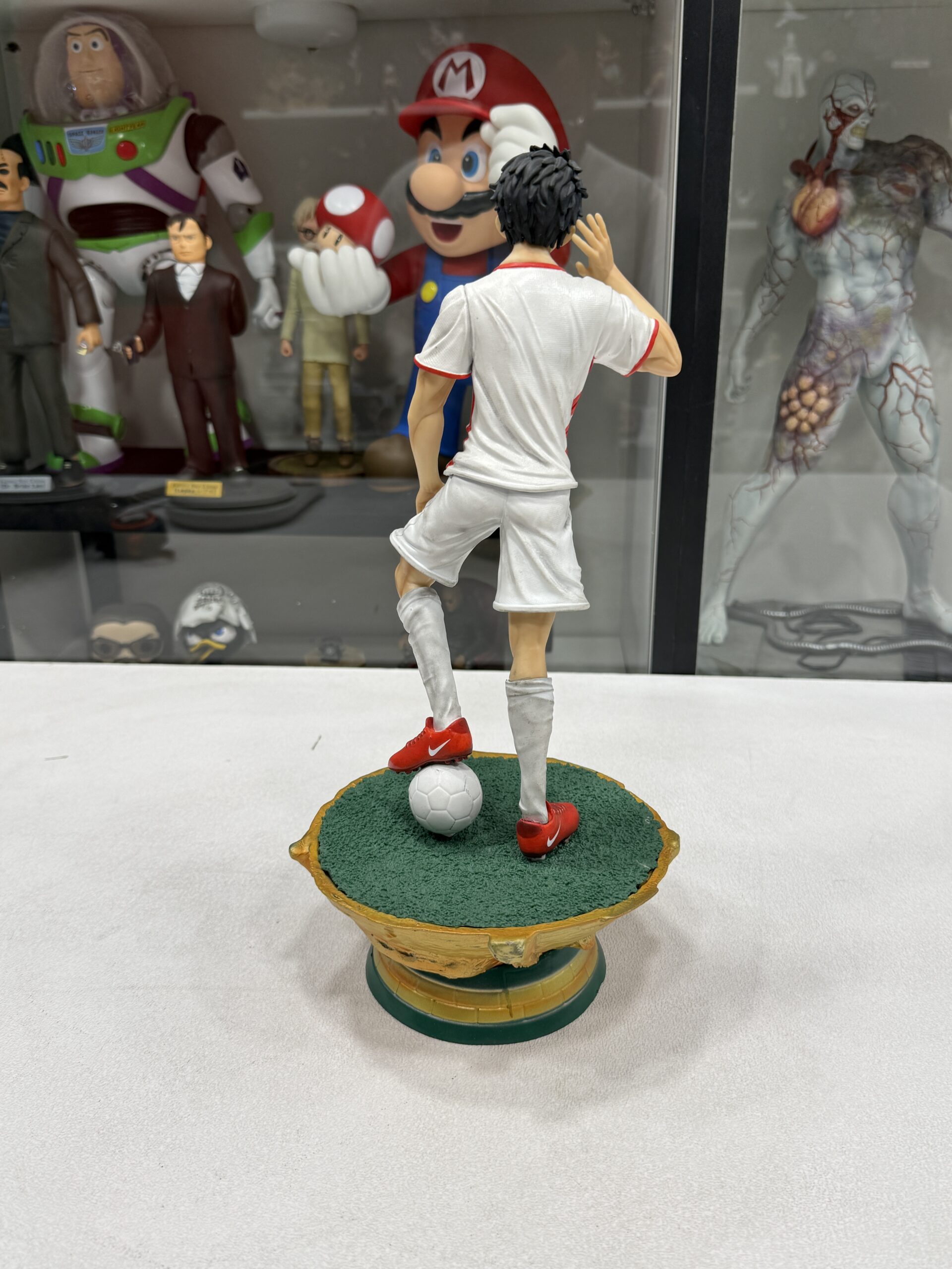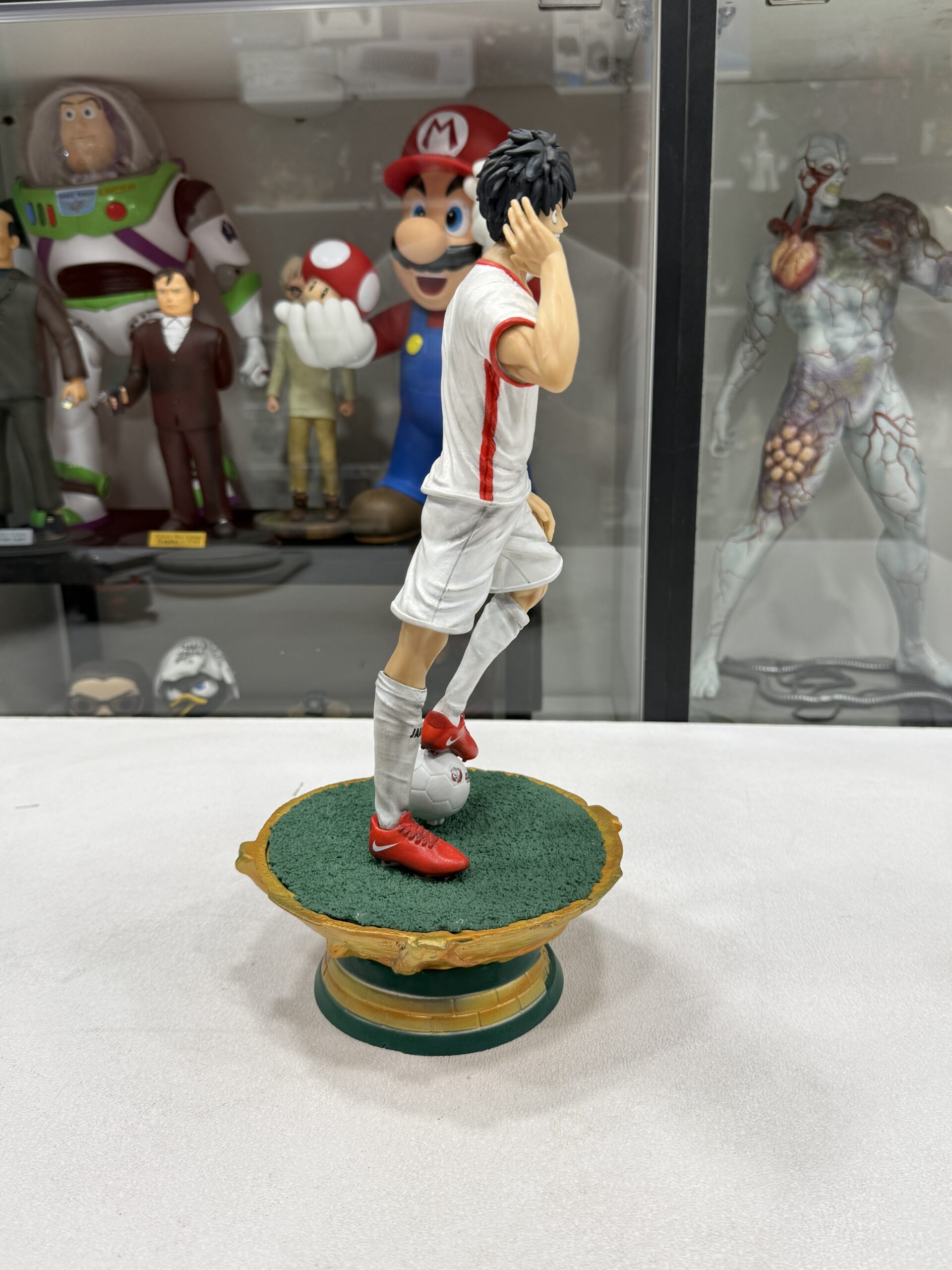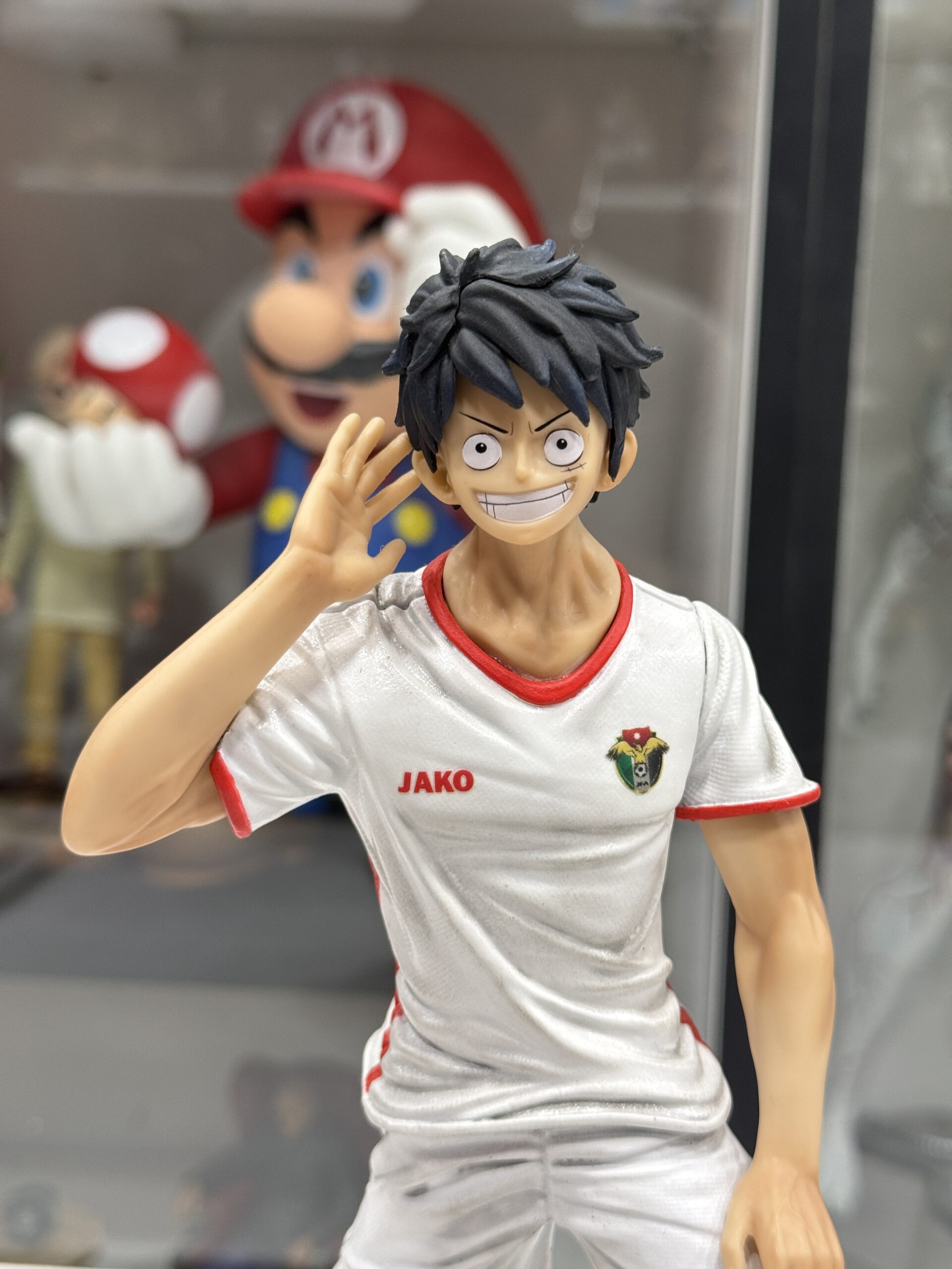 This statue represent luffy from One Piece in Jordan national team t-shirt with custom-made